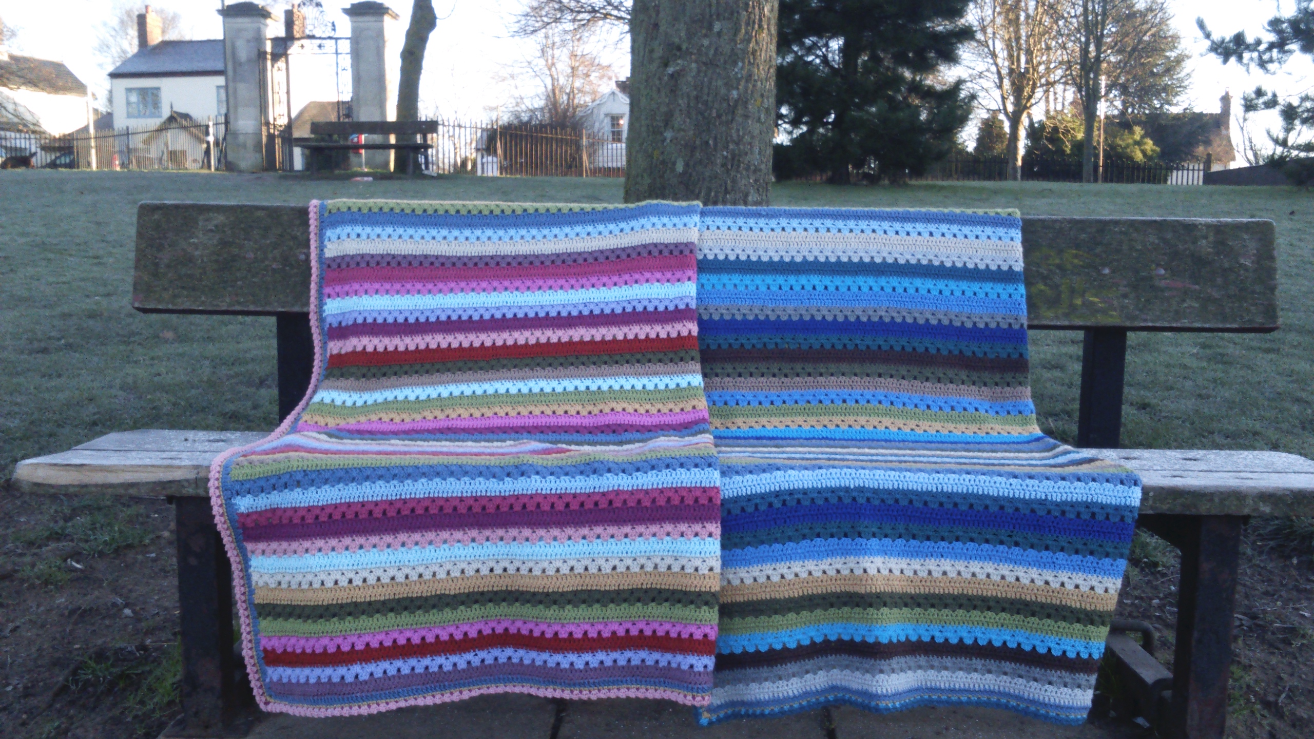 Each blanket is bordered with 4 rows of colour, the first 2 rows being shared by each blanket
