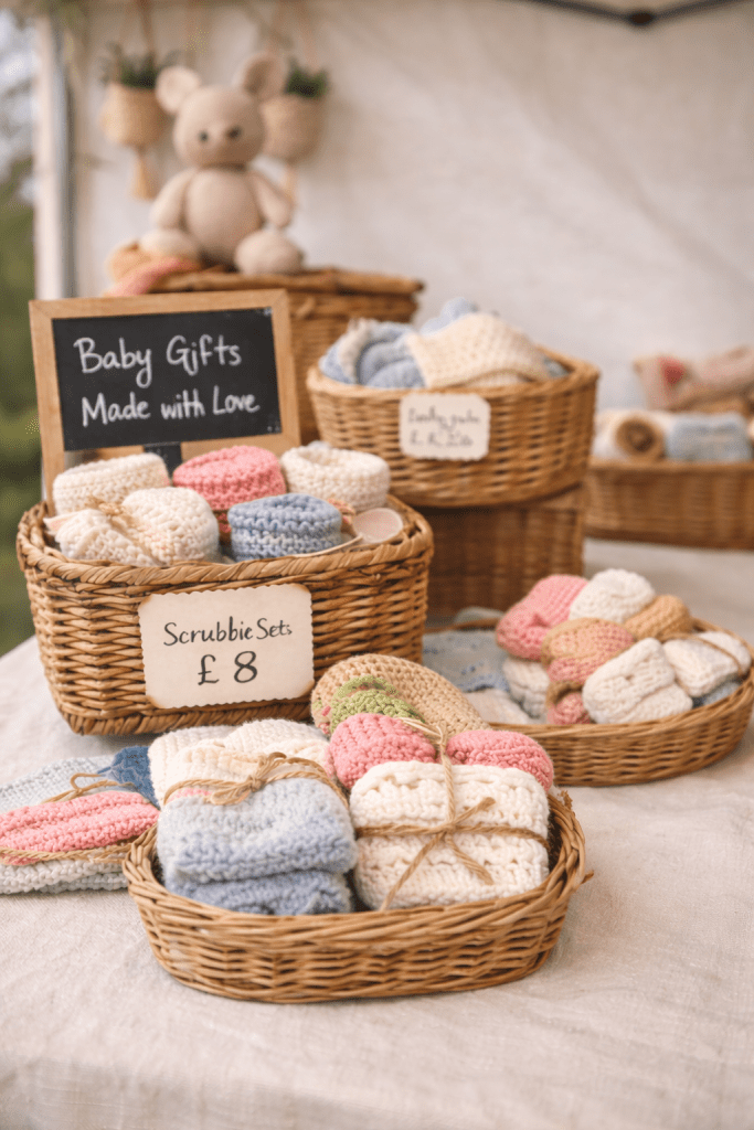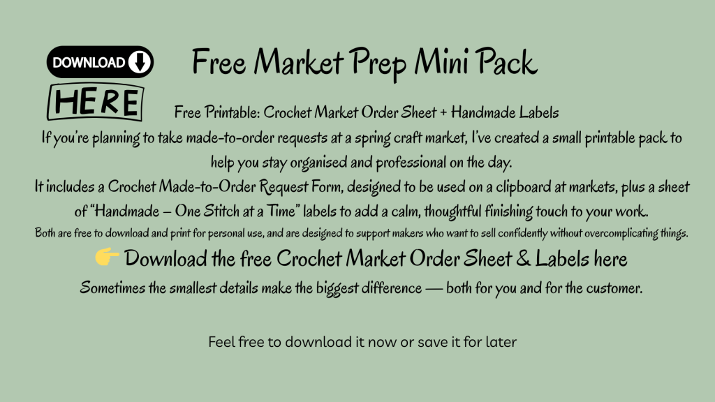 I’ve organised this post into easy sections. These include small giftable makes, baby items, and spring home décor. Other sections cover light wearables, taking orders using samples, and pricing crochet fairly. I also discuss how to help customers understand the value of your work without over-explaining, as well as tips on stocking your table. I have also included a FREE Mini Market Bundle printable. It comes with an order form and handmade labels. Feel free to skip straight to the parts most helpful for you.