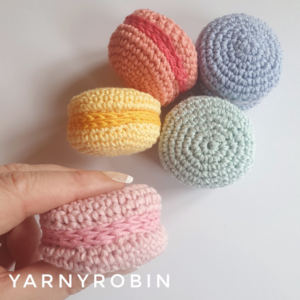 The hot Summer weather has me out and about and in the garden which isn’t leaving me a lot of crochet time. So I have been looking for small crochet wins to satisfy my creativity and to gain a sense of achievement with the little time I have. I have found myself creating delicious treats to add to my previous trio of cupcakes and have made these perfect macarons in beautiful pastel shades.