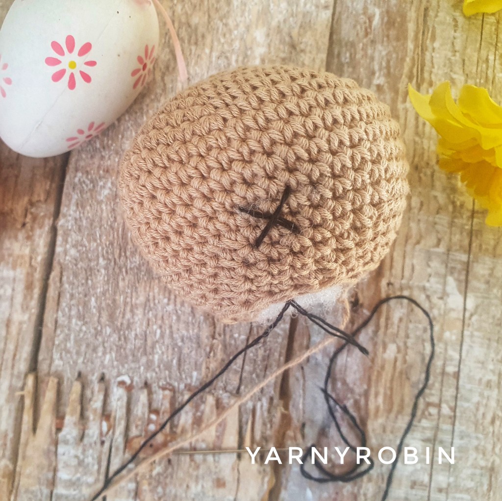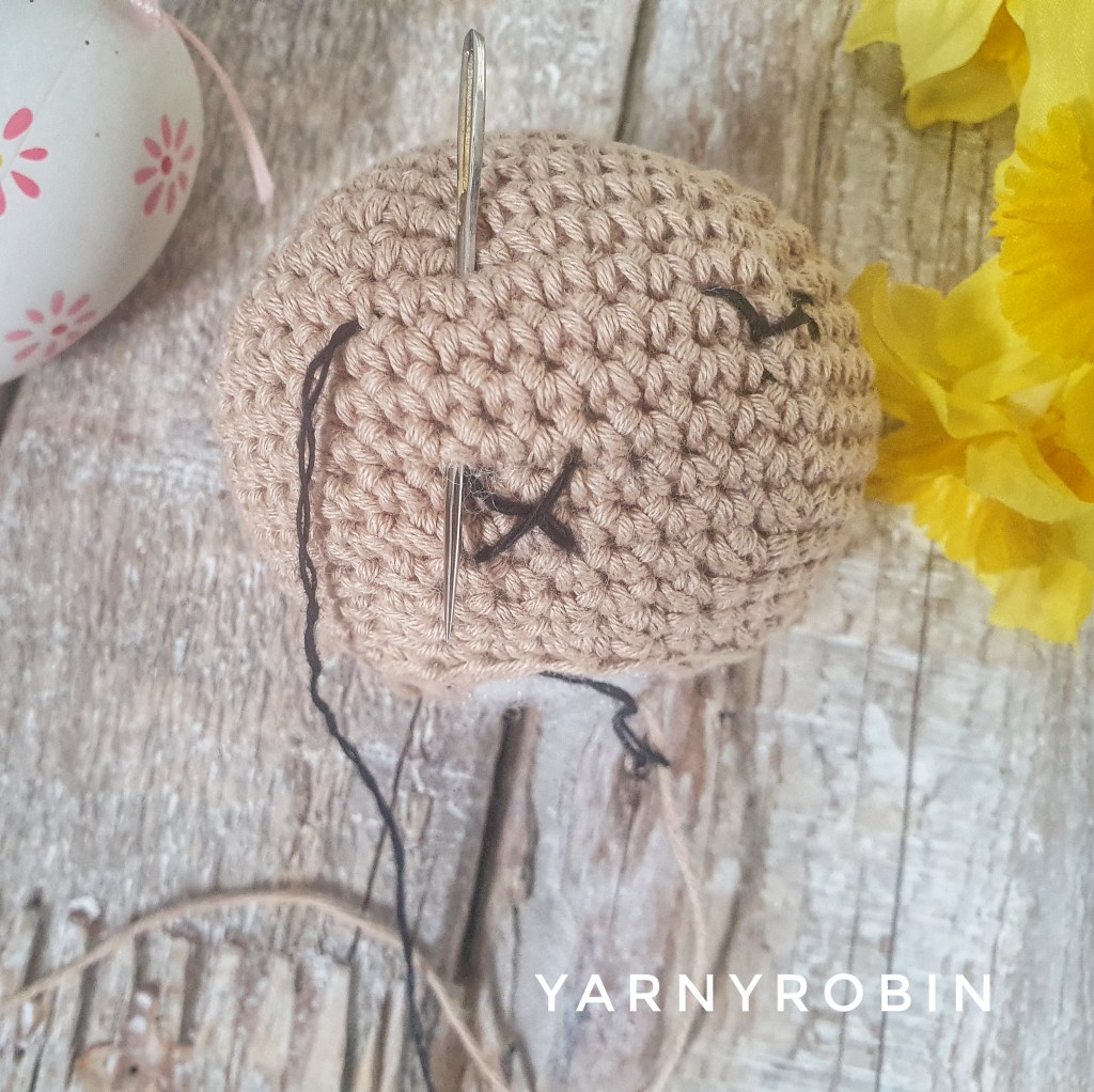 Start by threading your sewing needle and inserting it through the bottom of the head and leaving a small tail visible hanging from the stuffing. Exit needle on row 6 from the bottom of the head, insert needle diagonally into row 8. I made my diagonal stitch over 3 dcโs width. Exit needle in row 6 under previous entry point and insert at opposite diagonal. Do not fasten off move straight onto the eyes.