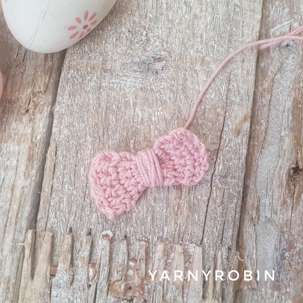 Fasten off and weave in ends. Take long piece of cotton and tie a knot in the middle of bow, snipping short the shorter tail. Now wrap long tail several times around the middle of the bow taking care to cover the tail you snipped short. To finish take the cotton wrapped around the bow and thread needle, finish by taking needle through the wrapped cotton on the backside and knot, leaving a long tail. Now with a darning needle, securely sew bow to the head and weave in any loose ends.