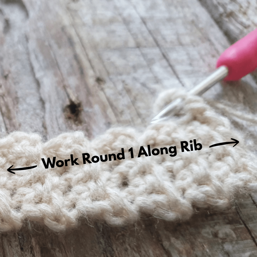 Round 1: ch1, 64dc evenly around top of brim – 2dc in first and last st then aim to place a dc at the top of each rib, join with a slst to 1st dc (64dc)