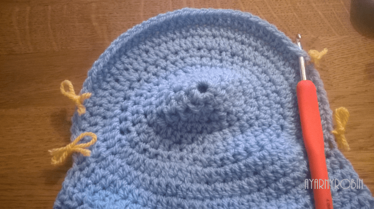 To mark out handle and spout holes, simply take x4 st markers (or cut short pieces of yarn in a different colour as I did) and place/ tie first marker in the st behind where you joined last row.
