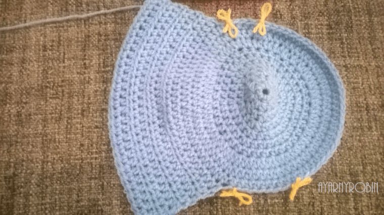 If adjusting cosy size make sure to finish this section on a row that is the same as row 3 in the pattern ie/ starts and finishes with 1tr.
