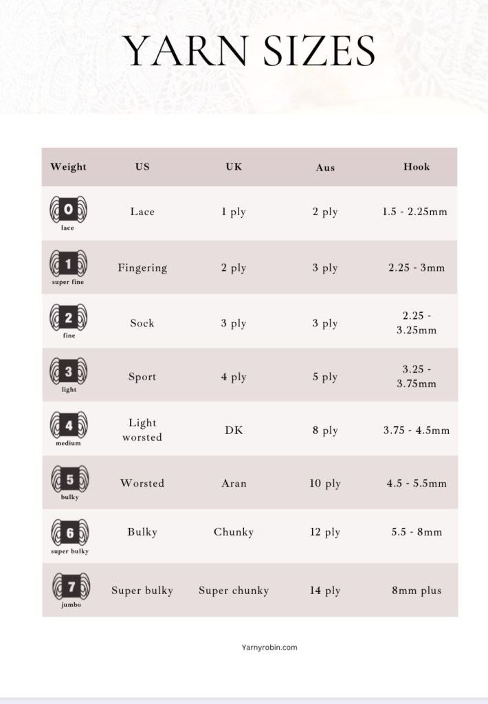 I have created a handy chart to explain yarn weights in some more detail. You will notice that across the top, you will find yarn weight names used in the UK, US, and Australia. To avoid the same mistake I made, you should know that crochet terminology has different languages. The most common being UK crochet terminology and US terminology.. This applies to referencing yarn sizes, hook sizes and stitches also. If you are skipping ahead, make the decision to stick to either UK or US terminology. Otherwise, you will become very confused! As you get more familiar, you will be able to use both terminologies. To begin with, it is easier to learn with either UK or US terminology. I learnt using UK terminology, but I don’t think it really matters greatly.